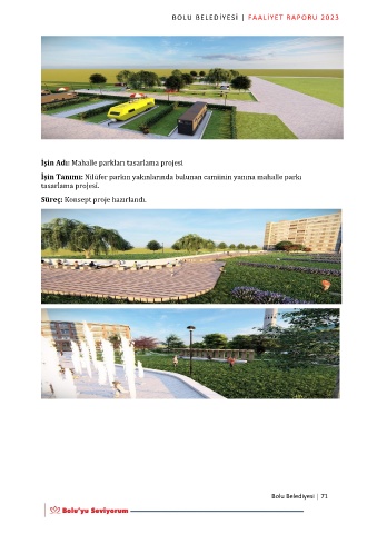 BOLU BELEDİYESİ | FAALİYET RAPORU 2023 İşin Adı: Mahalle parkları tasarlama projesi İşin Tanımı: Nilüfer parkın yakınlarında bulunan camiinin yanına mahalle parkı tasarlama projesi. Süreç: Konsept proje hazırlandı. Bolu Belediyesi | 71