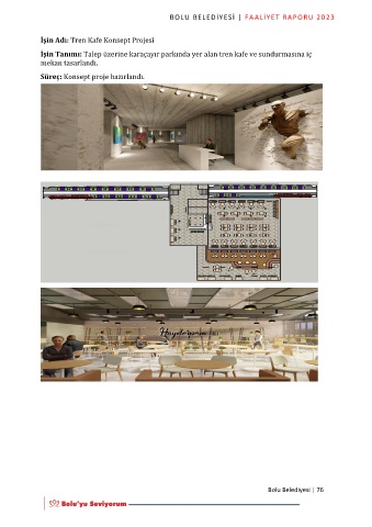 BOLU BELEDİYESİ | FAALİYET RAPORU 2023 İşin Adı: Tren Kafe Konsept Projesi İşin Tanımı: Talep üzerine karaçayır parkında yer alan tren kafe ve sundurmasına iç mekan tasarlandı. Süreç: Konsept proje hazırlandı. Bolu Belediyesi | 76