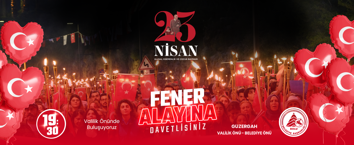 23 Nisan Ulusal Egemenlik ve Çocuk Bayramı kutlamaları kapsamında Bolu Belediyesi tarafından Fener Alayı yürüyüşü düzenlenecek. 23 Nisan Perşembe günü saat 19.30’da valilik önünden start alacak yürüyüşte, Bolulular, Belediye Bandosu eşliğinde Fener Alayı Yürüyüşü gerçekleştirecek. Meşaleler ve Türk bayrakları eşliğinde İzzet Baysal Caddesi boyunca sürecek yürüyüş, belediye önünde son bulacak.